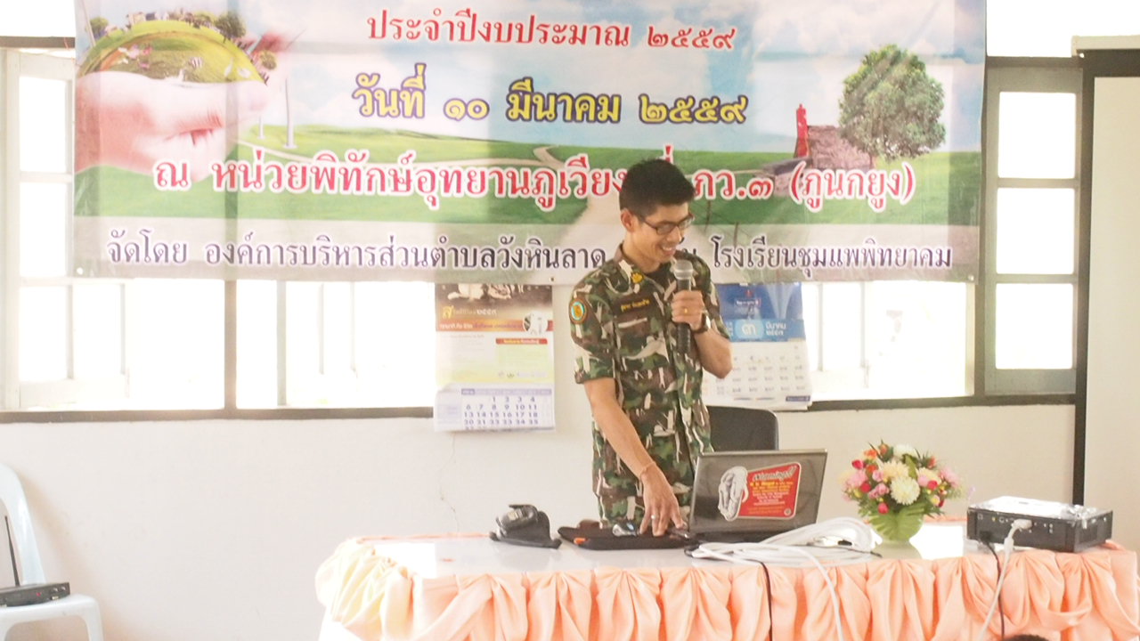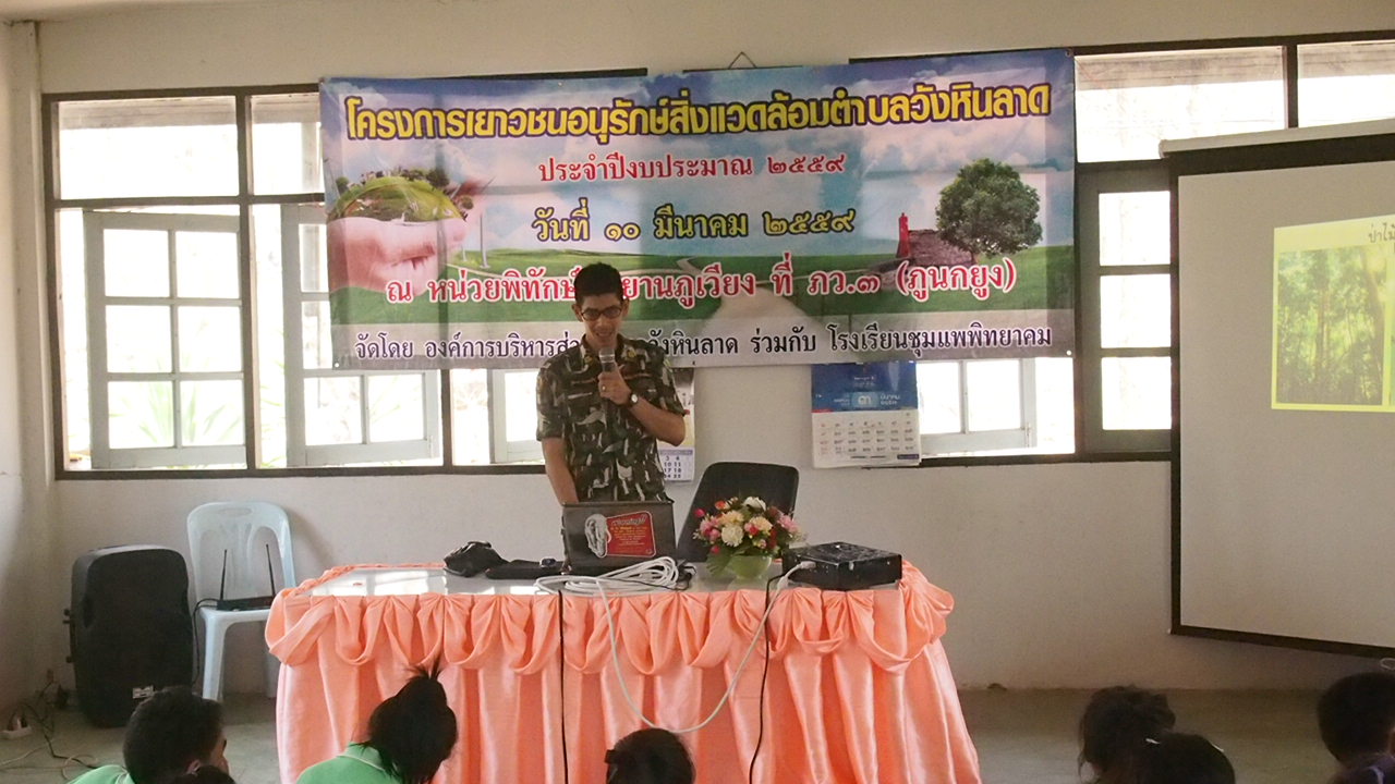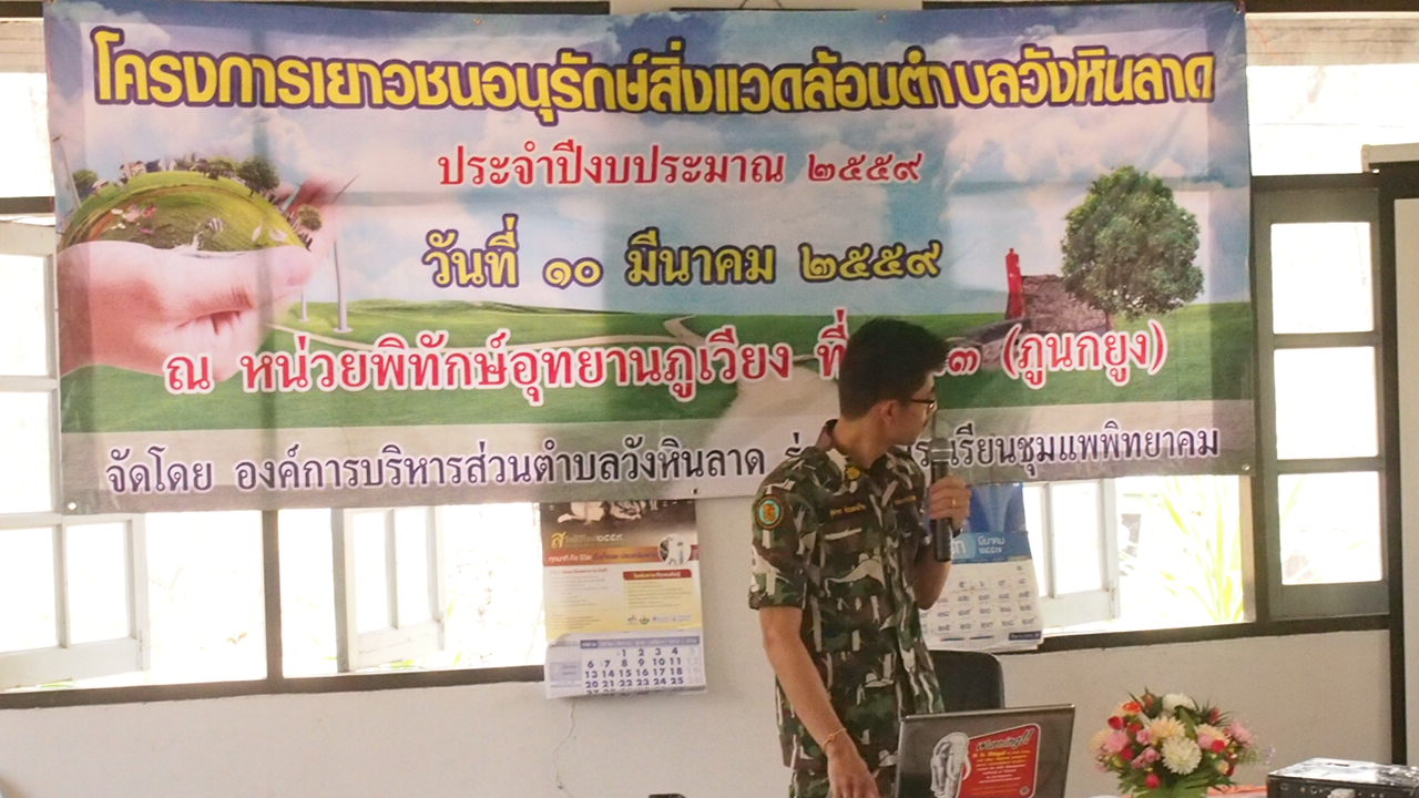 องค์การบริหารส่วนตำบลวังหินลาดได้จัดโครงการค่ายเยาวชนแกนนำสิ่งแวดล้อมตำบลวังหินลาด ประจำปีงบประมาณ 2559 โดยเป็นการดูแลและบำรุงรักษาและการใช้ประโยชน์จากป่าไม้ ที่ดินทรัพยากรธรรมชาติและสิ่งแวดล้อม เพื่อให้เยาวชนมีความรู้ความเข้าใจ เกิดแนวคิดในการบริหารจัดการทรัพยากรธรรมชาติ ให้เยาวชนได้รวมกลุ่มกันทำกิจกรรมในทางการสร้างสรรค์ และเป็นแกนนำกลุ่มเยาวชนในการอนุรักษ์สิ่งแวดล้อมในท้องถิ่น ทำให้เกิดการสร้างแนวคิด ทัศนคติ การบูรณาการในการแก้ไขปัญหาสิ่งแวดล้อม และจิตสำนึกที่ดีให้เยาวชนในการอนุรักษ์ทรัพยากรธรรมชาติ ได้ดำเนินการจัดโครงการเมื่อวันที่ 10 มีนาคม พ.ศ. 2559 ณ หน่วยพิทักษ์อุทยานภูเวียง ที่ ภว.3 (ภูนกยูง) โดยมีวิทยากร จากอุทยานแห่งชาติภูเวียง เป็นผู้มาให้ความรู้เกี่ยวกับ “มนุษย์กับสิ่งแวดล้อม/คุณภาพสิ่งแวดล้อม”